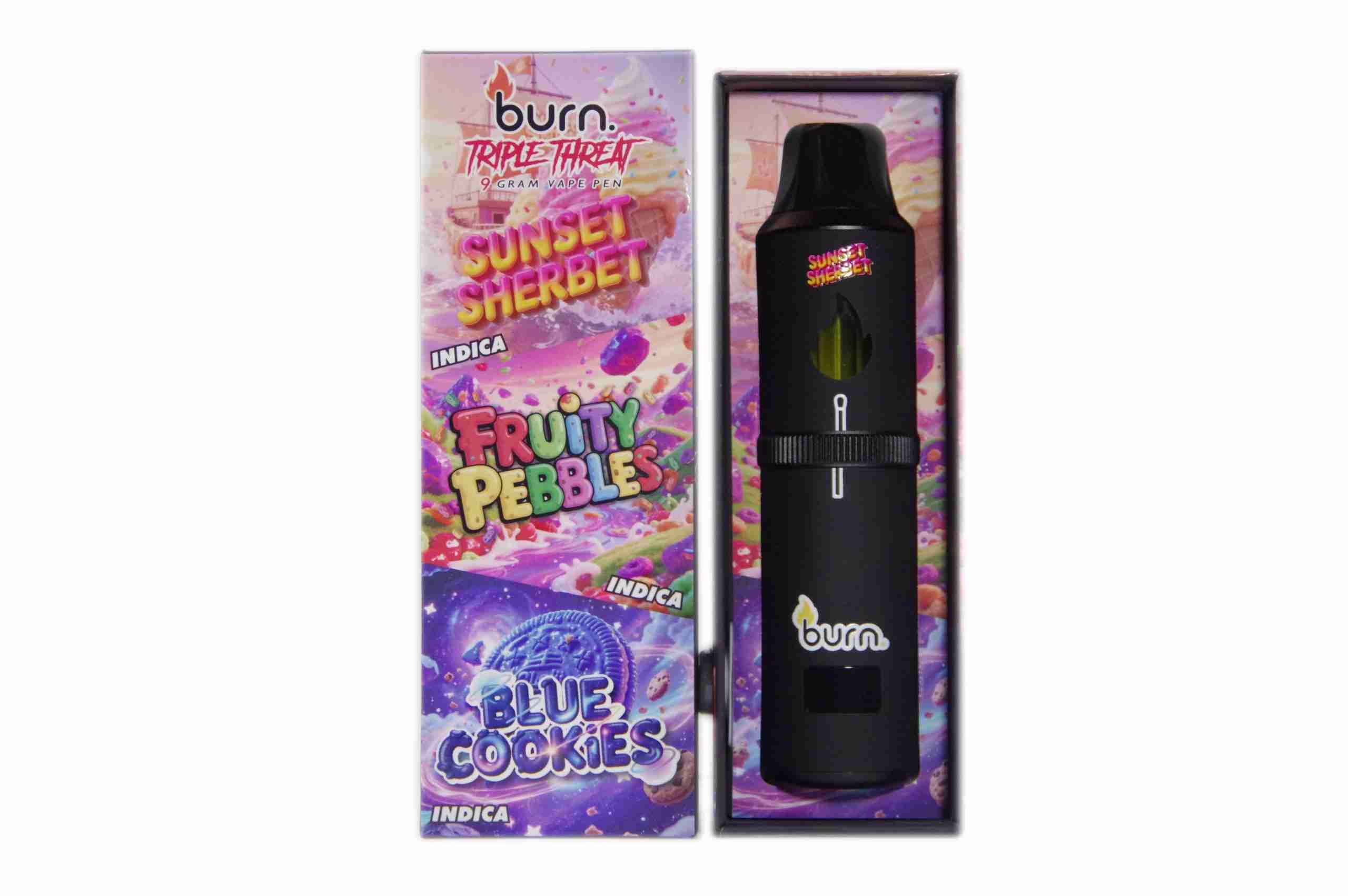 Introducing the Burn Triple Threat Pen (9g) - Sunset Sherbet + Fruity Pebbles + Blue Cookies, a premium product from Disposable Pens & Kits, Vapes. Known for its exceptional quality, this product delivers top-notch performance and reliability.
