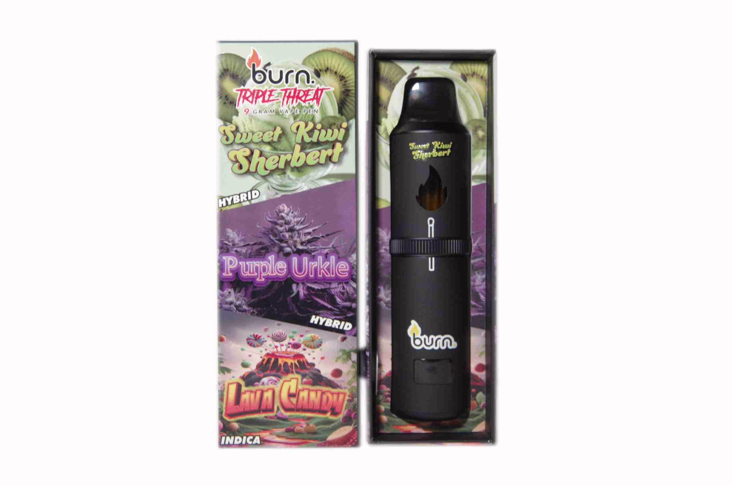 Introducing the Burn Triple Threat Pen (9g) - Sweet Kiwi Sherbet + Purple Urkle + Lava Candy, a premium product from Disposable Pens & Kits, Vapes. Known for its exceptional quality, this product delivers top-notch performance and reliability.