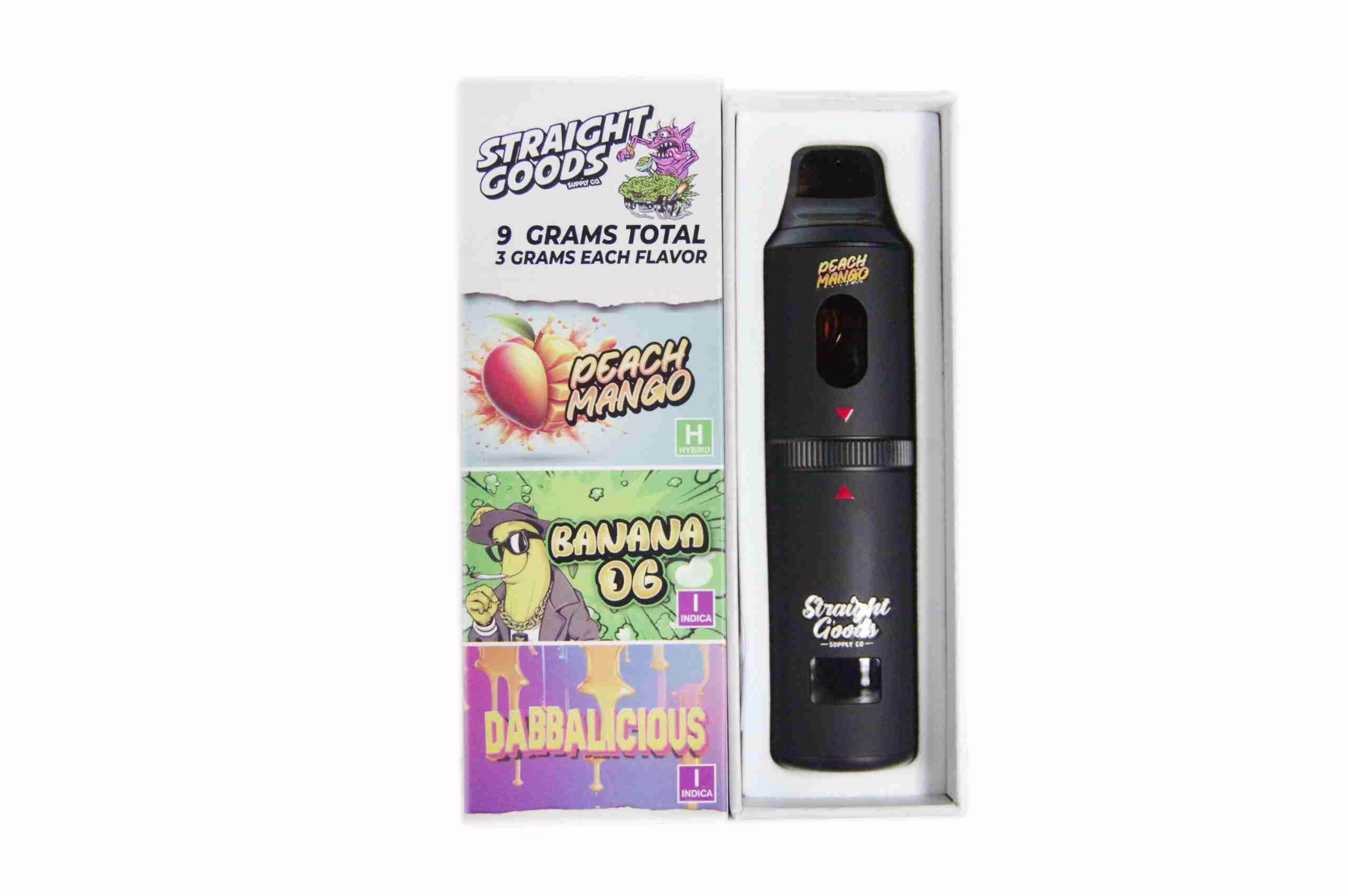 Priced at $120.00, the Straight Goods Triple Chamber Pen (9g) - Peach Mango + Banana OG + Dabbalicious provides excellent value and is suitable for users of all levels.